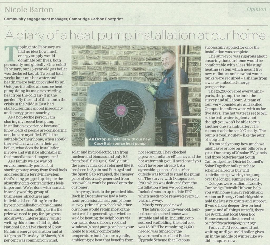 Here’s the latest monthly Opinion piece in the Cambridge Independent by CCF’s Community Engagement Manager Nicole Barton, happily detailing the installation of her family’s new heat pump. An inspiration!