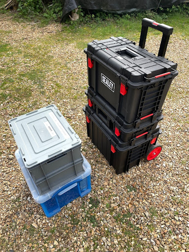 Smaller toolbox with tote tray containing small hand tools, power supply and some larger consumables